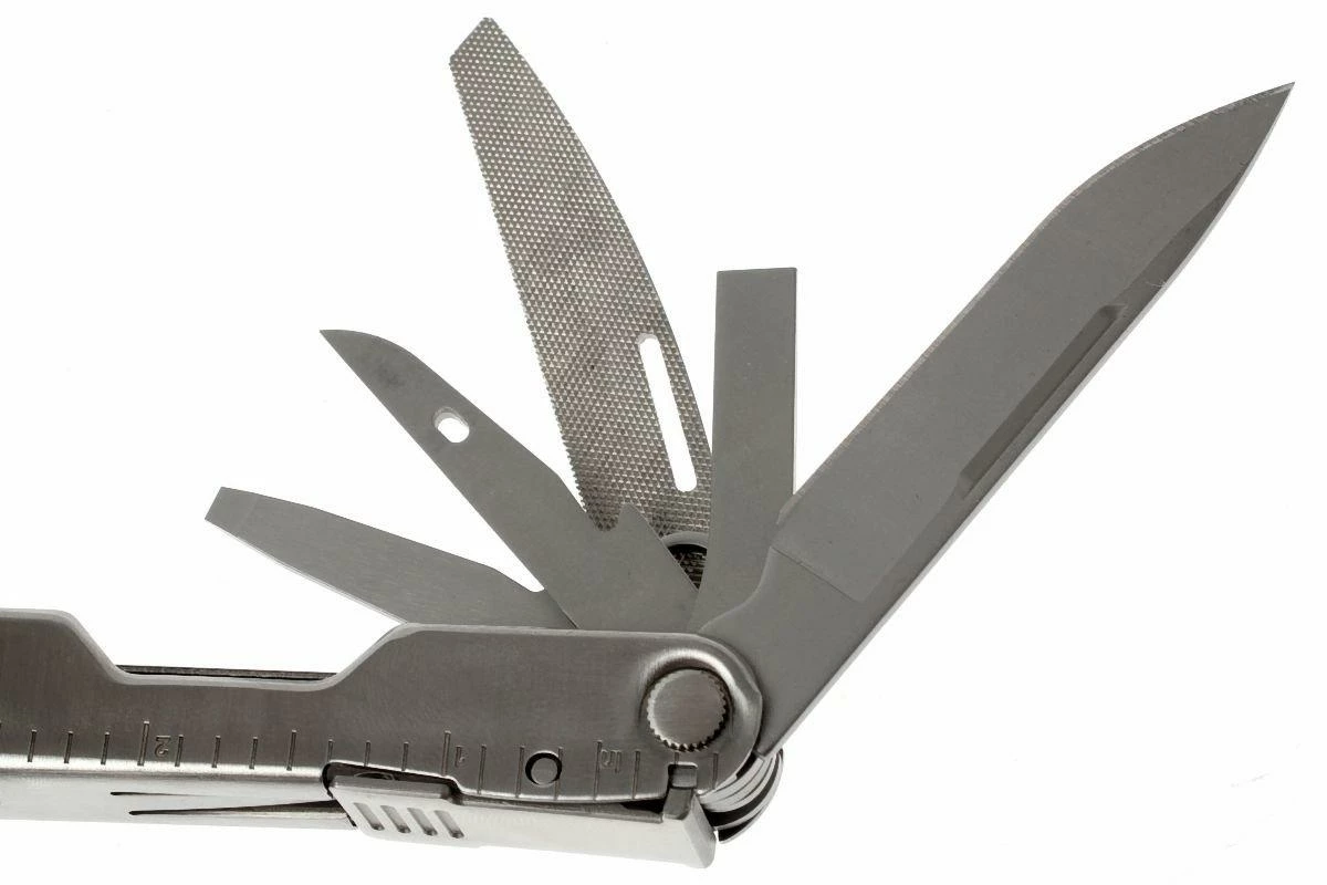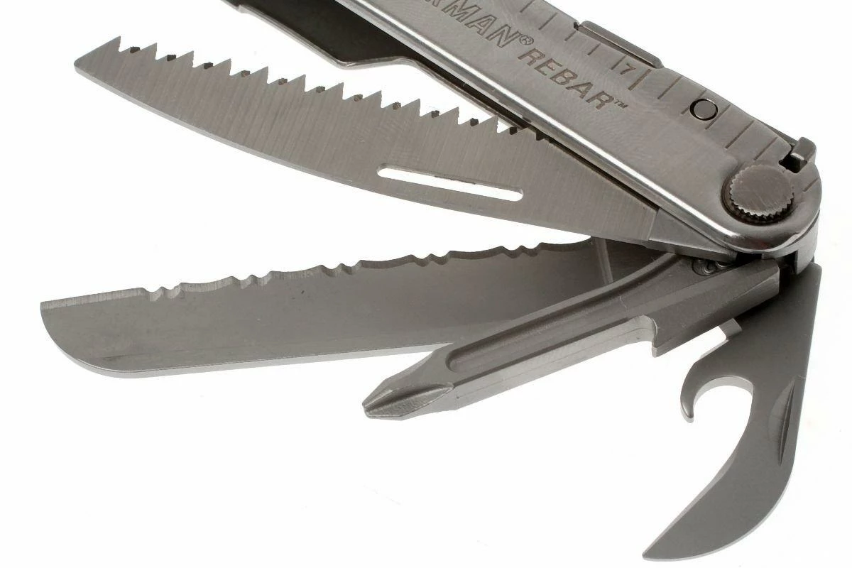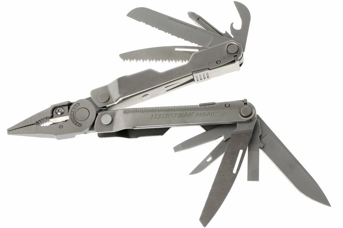 Multitool in klassischem, kompakt-kultigem Design, mit Zange und 2 Messern. Trotz seiner kompakten Bauweise vereint das Rebar doch sämtliche Funktionen, die es auf Baustellen und bei Heimwerkern sehr schnell unentbehrlich machen werden. Das Multitool verfügt unter anderem über eine extrastarke Zange mit integriertem, auswechselbarem Drahtschneider. Alle Tools sind außerdem mit einer Arretierung gegen versehentliches Einklappen ausgestattet.