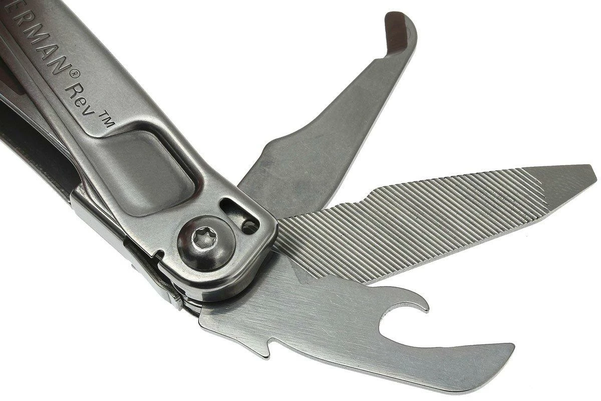 Das Leatherman REV ist ein kompaktes und vollwertiges Multitool aus rostfestem Stahl. Die Messerklinge ist aus 420HC Stahl geschmiedet und kann geöffnet durch einen Linerlock arretiert werden. Die anderen Werkzeuge werden nicht arretiert. Das REV ist mit einem Befestigungsclip ausgestattet.