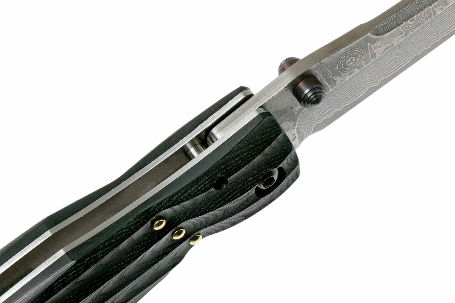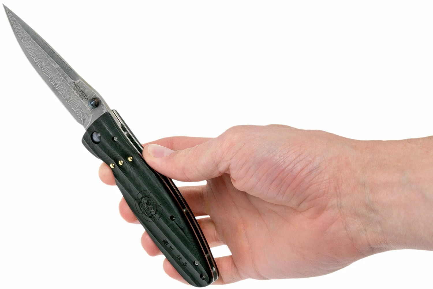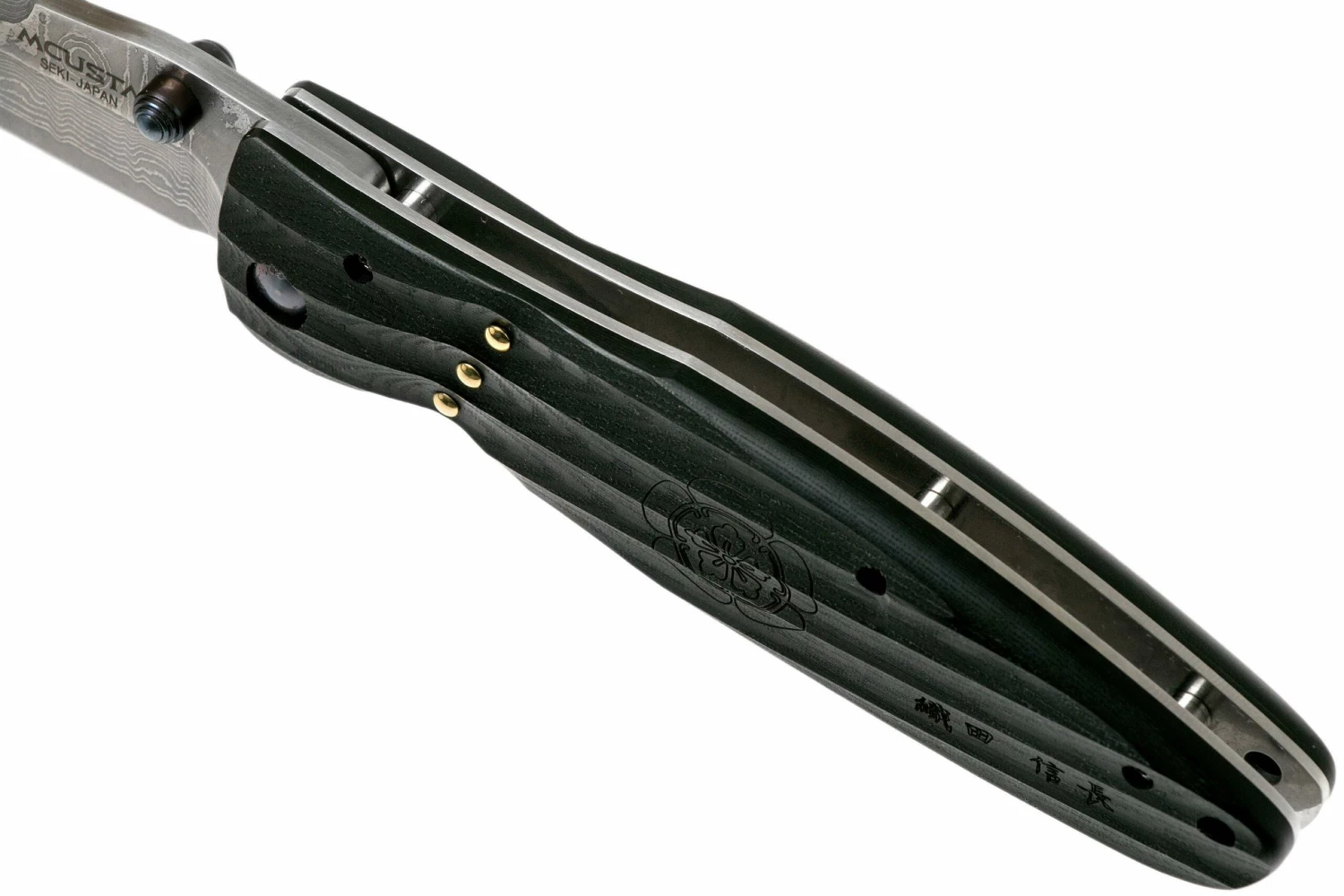 Das Mcusta MC-181D Sengoku Oda Nobunaga ist ein besonderes japanisches Taschenmesser, mit sehr schönen Details. Die Klinge besteht aus einem Kern aus VG10-Stahl, der an den Seiten mit schönem Nickeldamast überzogen ist. Die Schneide ist, wie wir es von japanischen Herstellern kennen, sehr scharf. Auch der Griff ist sehr außergewöhnlich: das schwarze Micarta ist in 3D gefräst. Das Ergebnis ist ein wunderschöner Griff, der auch noch einen tollen Halt bietet. Auf dem Griff sind drei Messingstifte angebracht.