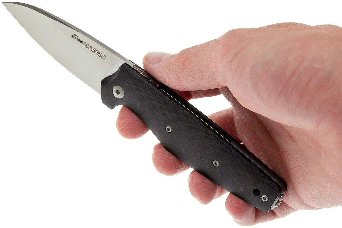 Das Viper Dan 2 ist ein stilvolles „friction folder“ mit einem feinen, tief sitzenden Taschenclip. Ein Friction Folder ist ein Taschenmesser ohne echte Verriegelung. Allerdings ist an der Klinge ein Widerstand zu spüren, so dass sie nicht einfach zuschnappt. Du kannst das Messer mithilfe des Flippers recht einfach öffnen. Im geöffneten Zustand sitzt der Flipper sauber auf der Rückseite der Klinge, genau dort, wo Du Deinen Daumen halten würdest. Durch den Druck Deines Daumes nach unten, bleibt das Messer während des Gebrauchs immer offen. Friction folders sind beliebt, weil sie unter anderem im Vereinigten Königreich und in Deutschland legal mitgeführt werden dürfen. Außerdem ist es natürlich ein schöner Mechanismus, der auch von vielen Menschen geschätzt wird.
